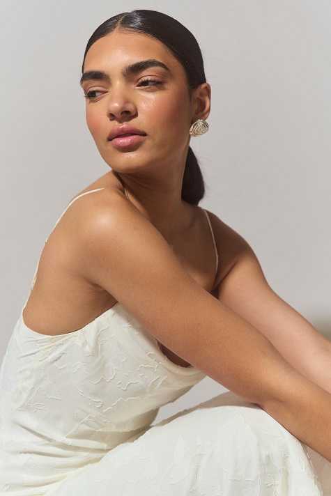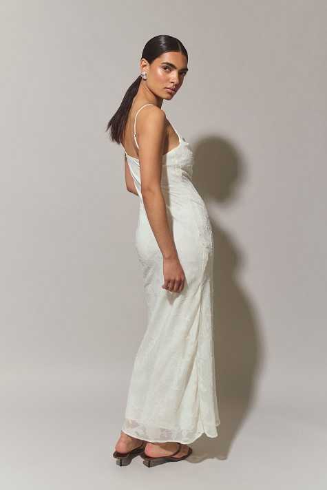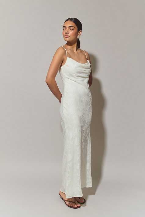 Floral maxi dress with cowl neck. The dress is white, sleeveless and lined. It has adjustable shoulder straps and regular fit.