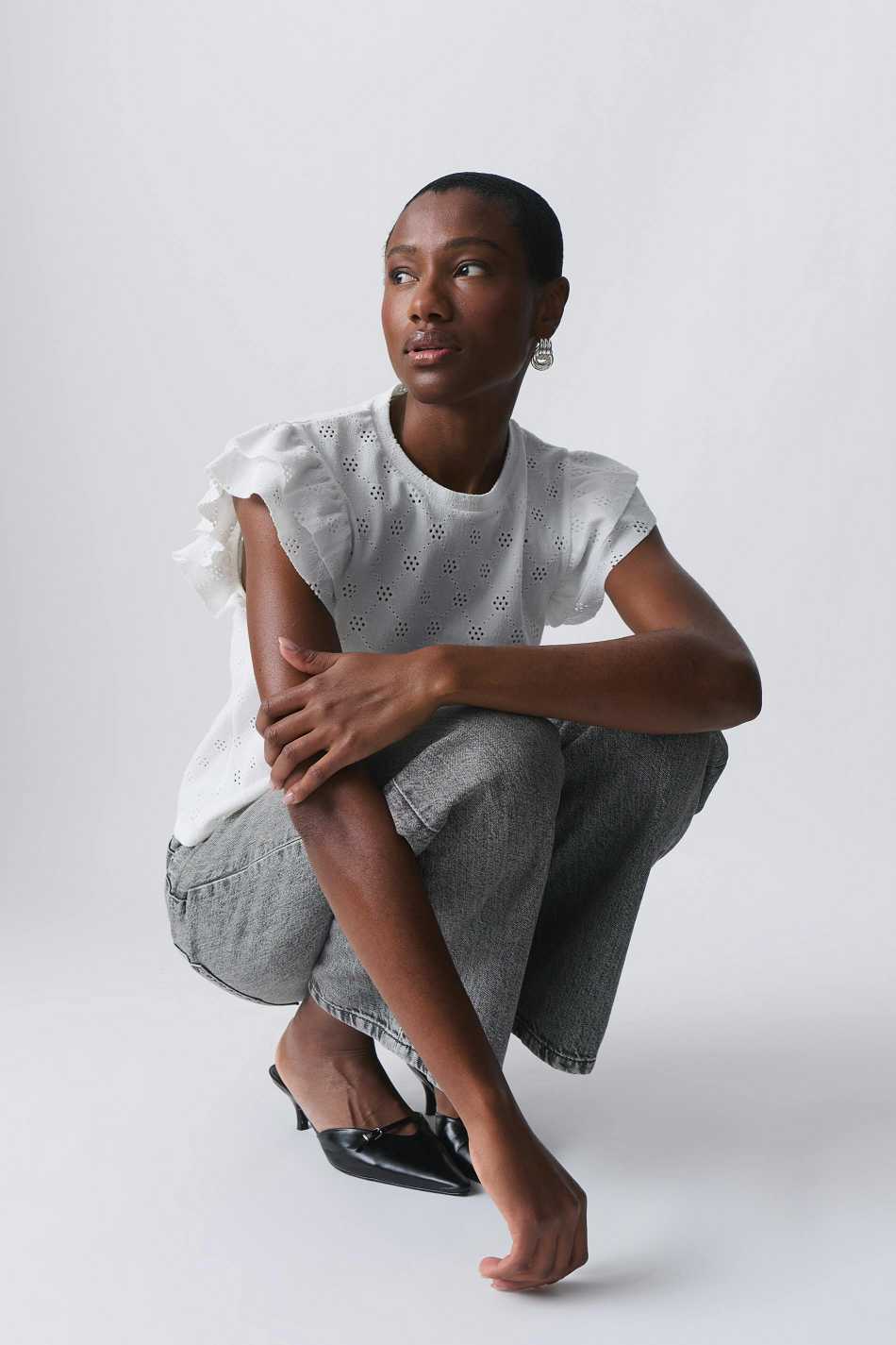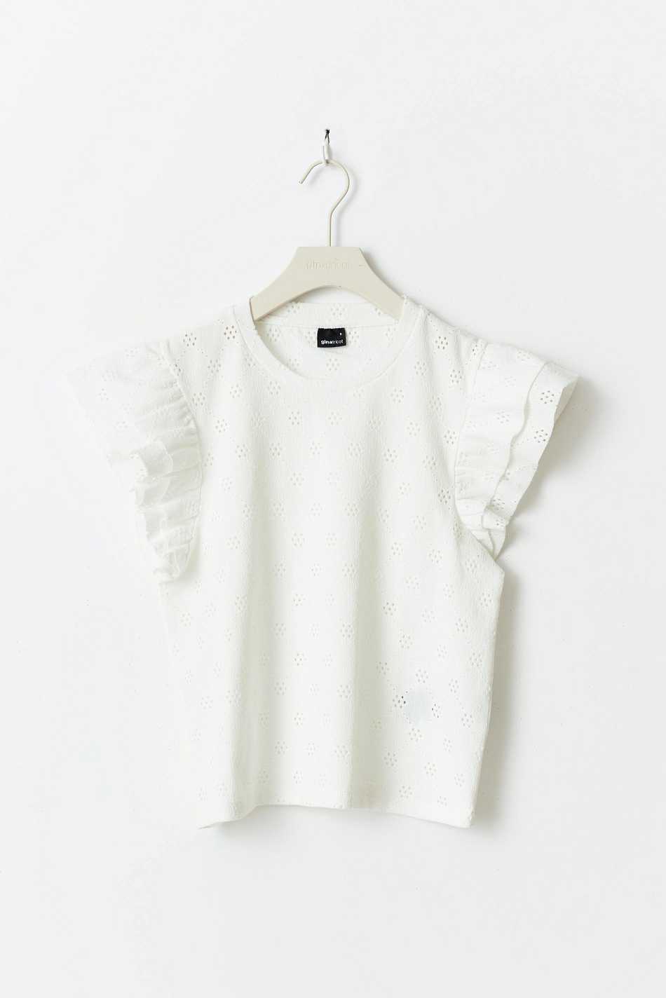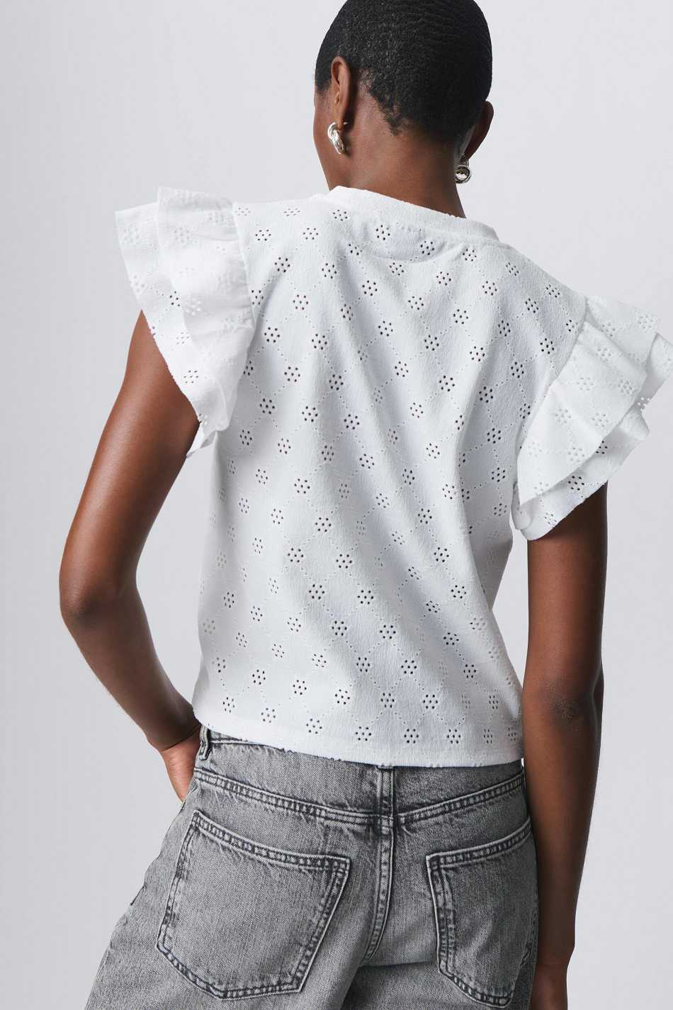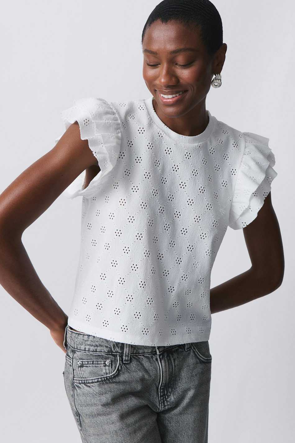 Pointelle knit top with short frilled sleeve. The top is white and has regular fit. It has round neckline and short length.
