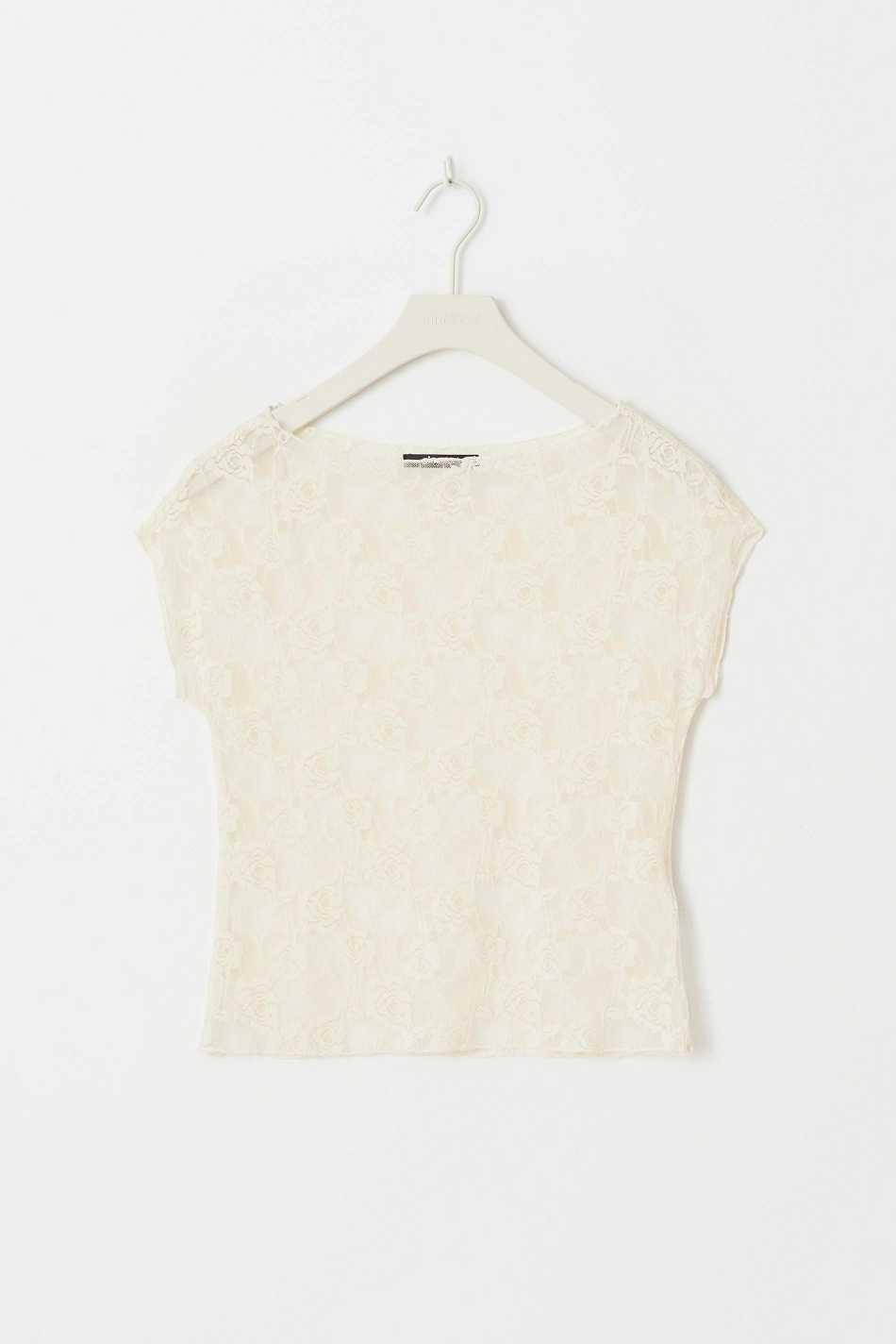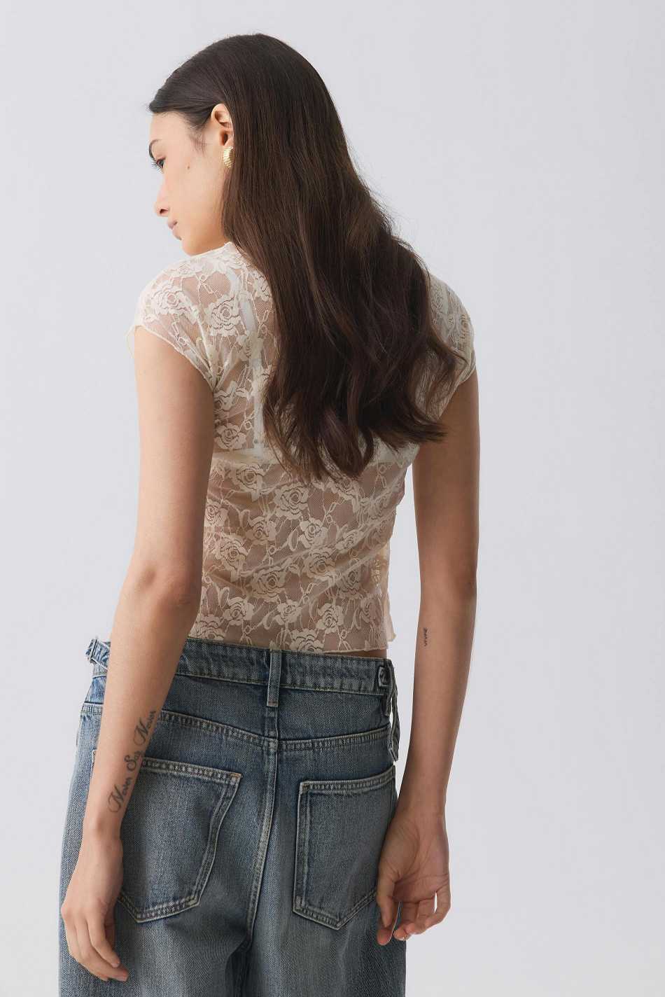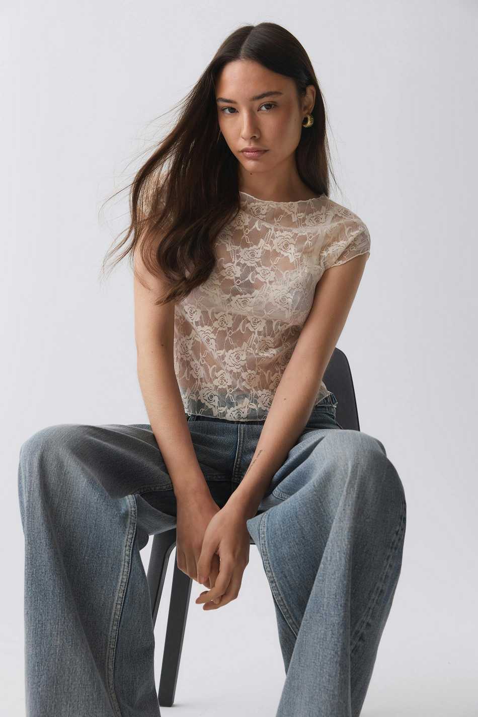 Short-sleeved lace top with high neckline. The top is beige and has figure-hugging fit. It has floral lace pattern and regular length. Unlined.