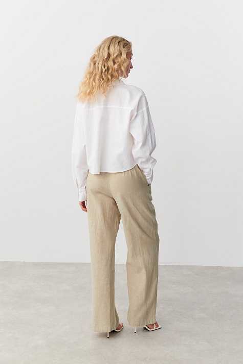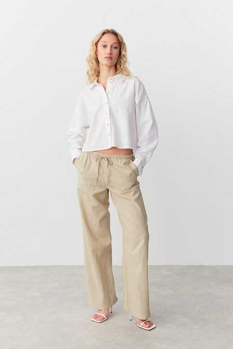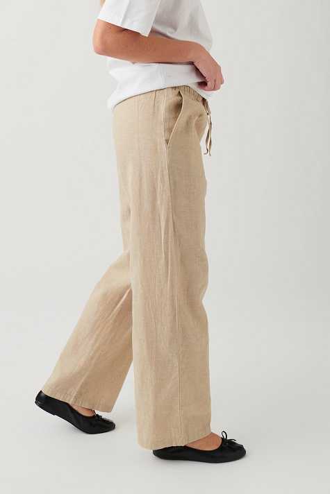 Linen trousers with wide legs. The linen trousers are beige and have mid waist. They have side pockets and elastic at the waist with self-tie drawstring at the front.
