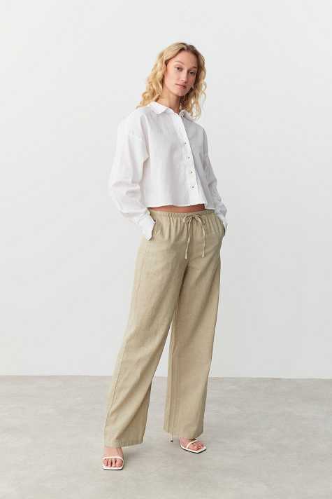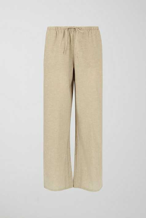Linen trousers with wide legs. The linen trousers are beige and have mid waist. They have side pockets and elastic at the waist with self-tie drawstring at the front.