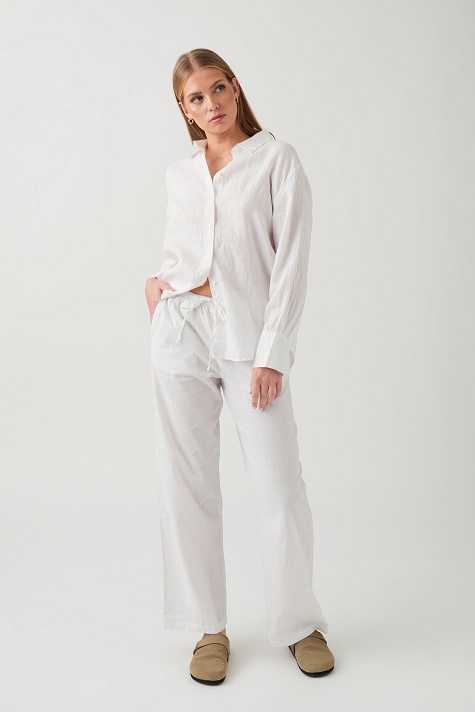Linen trousers with wide legs. The linen trousers are white and have mid waist. They have side pockets and elastic at the waist with self-tie drawstring at the front.