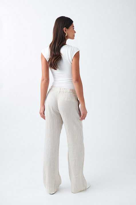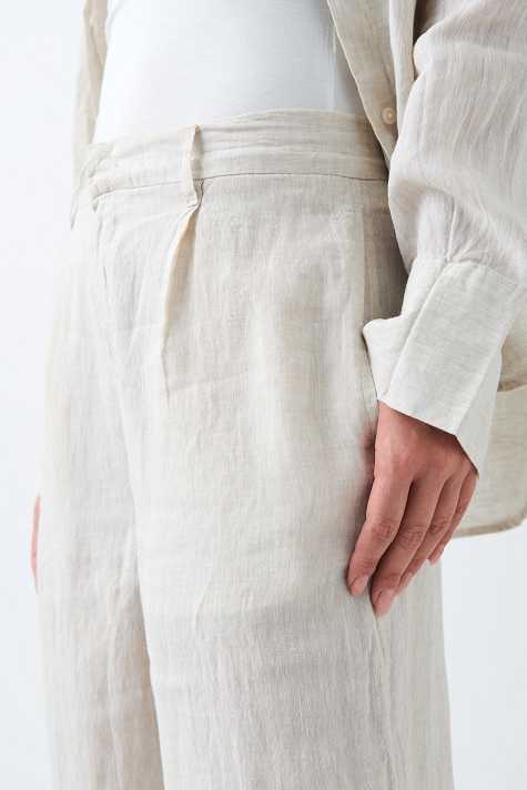 Linen trousers with loose-fitting style. The linen trousers are beige and have pleats at the front. They have straight legs, elastic at the back of the waist, belt loops, side pockets and a welt pocket at the back.