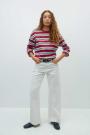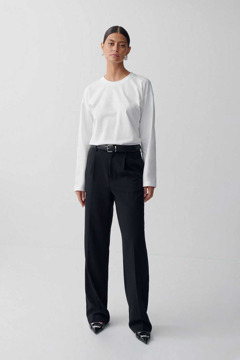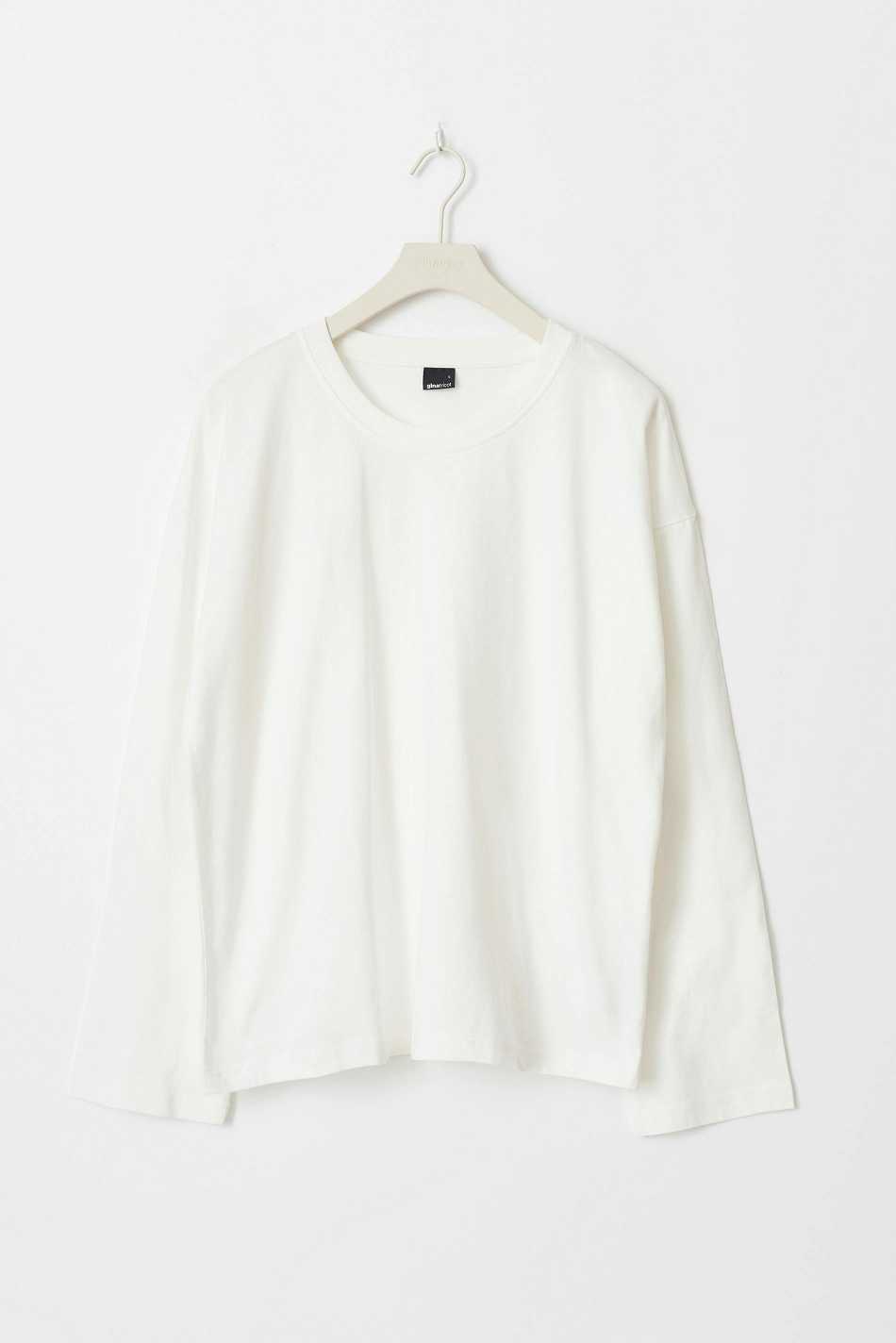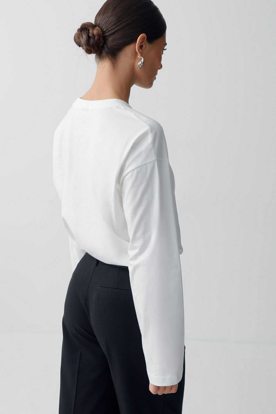 Long sleeve tee with oversize fit. The t-shirt is white and has round neckline. It has dropped shoulder, ribbing on the neckline and regular length.