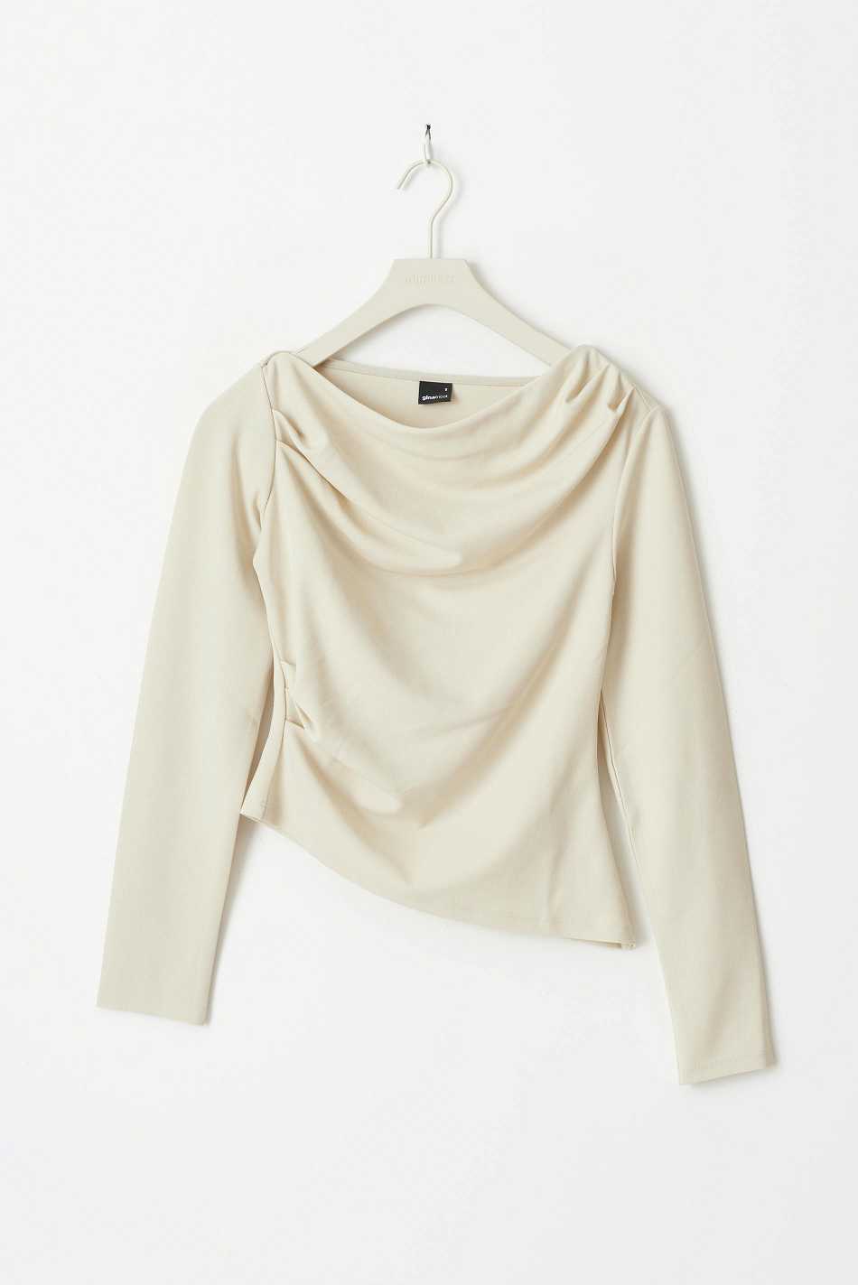Long sleeve top with boat neckline. The top is beige and has drapings at the front. It has figure-hugging fit and stretchy quality.