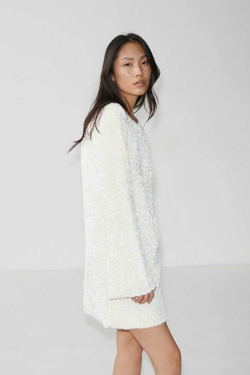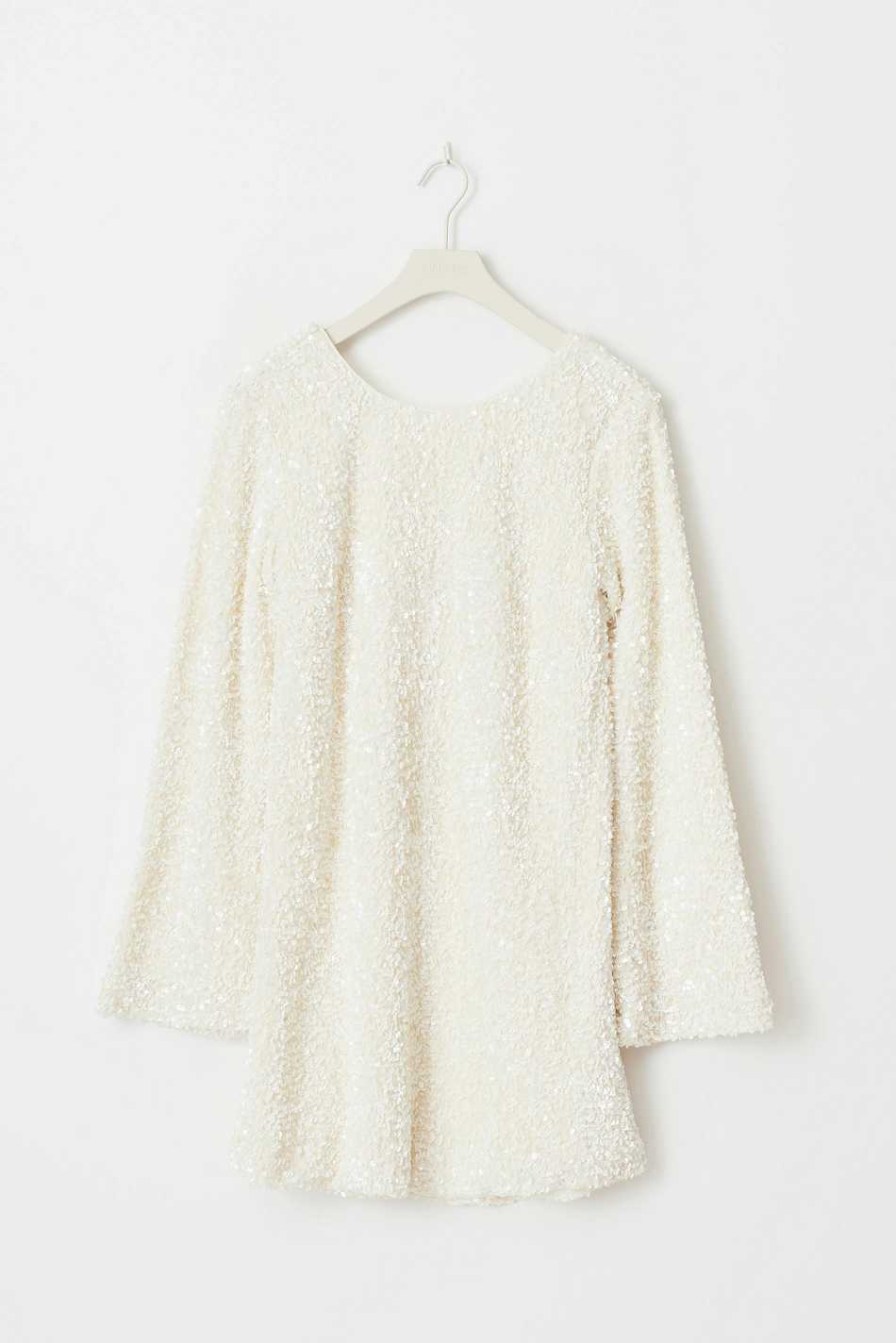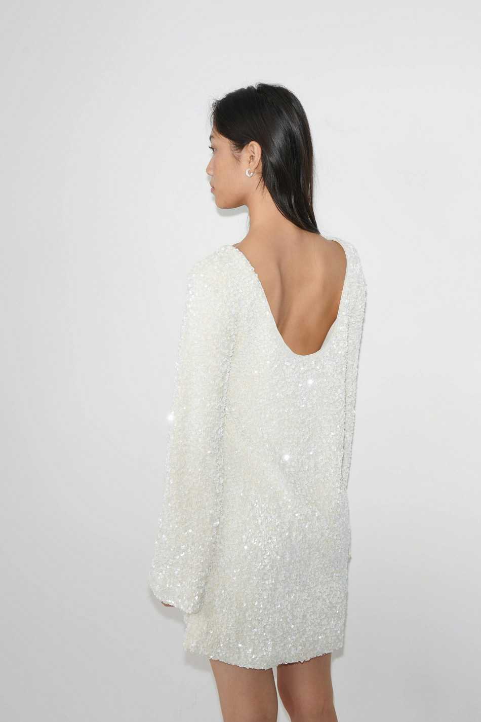 Short sequin dress with open back. The dress is white and has long sleeve. It has round neckline and loose-fitting style. Lined.