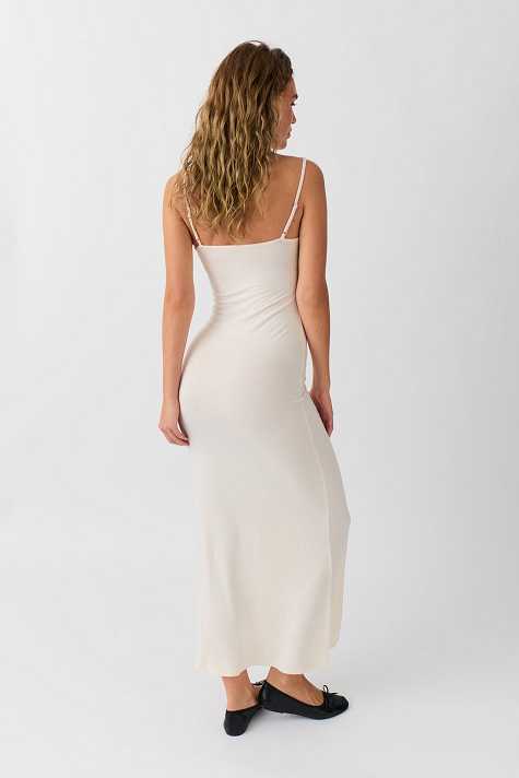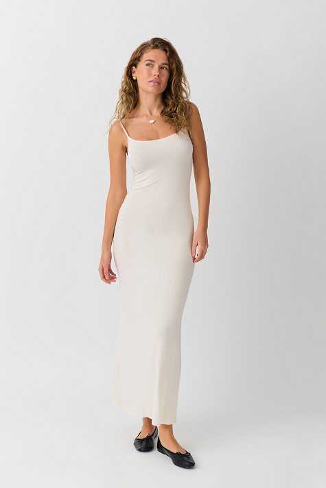 Soft touch – second skin comfort. Sleeveless maxi dress with figure-hugging fit. The dress is white, long and stretchy. It has narrow, adjustable shoulder straps and flared hem.