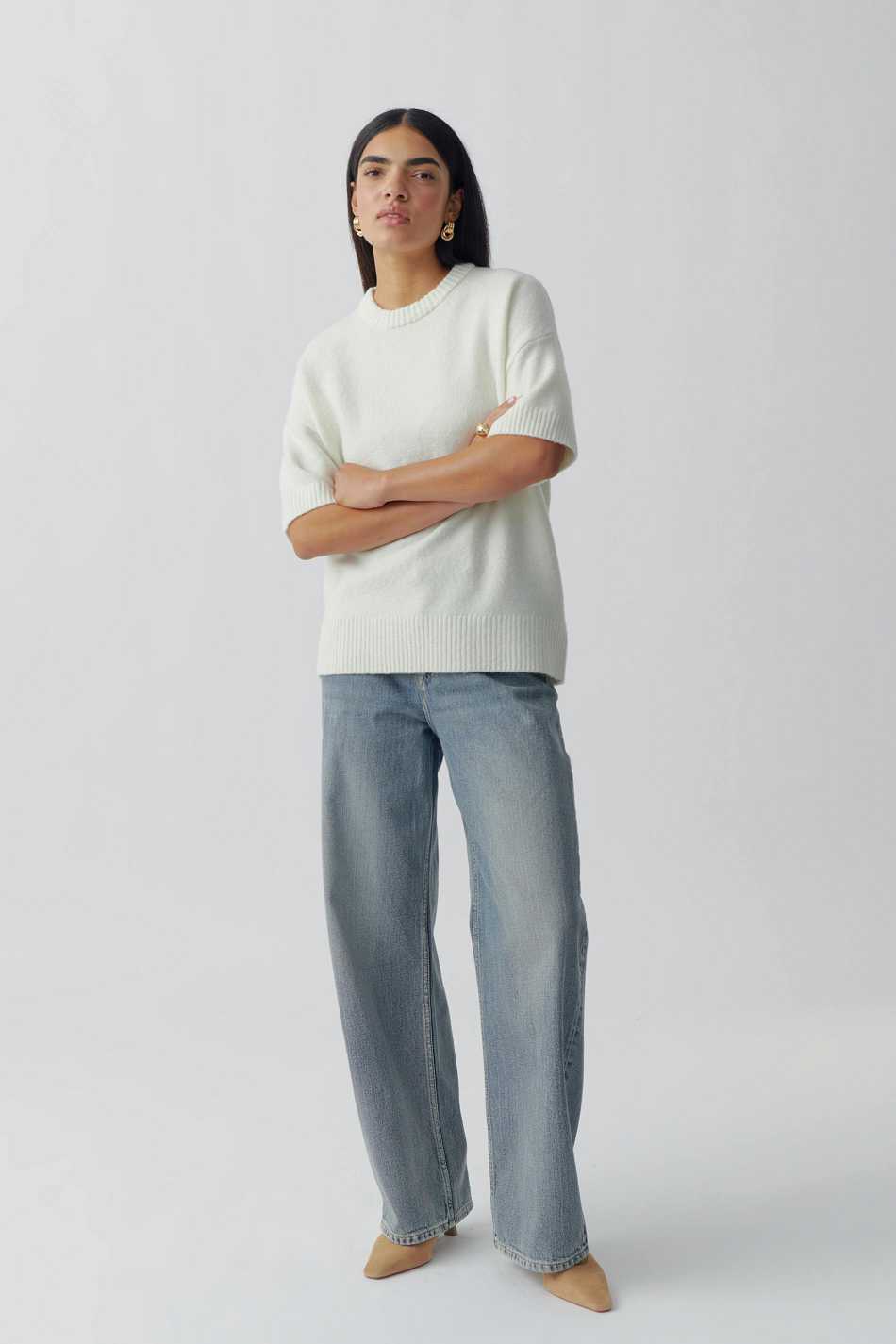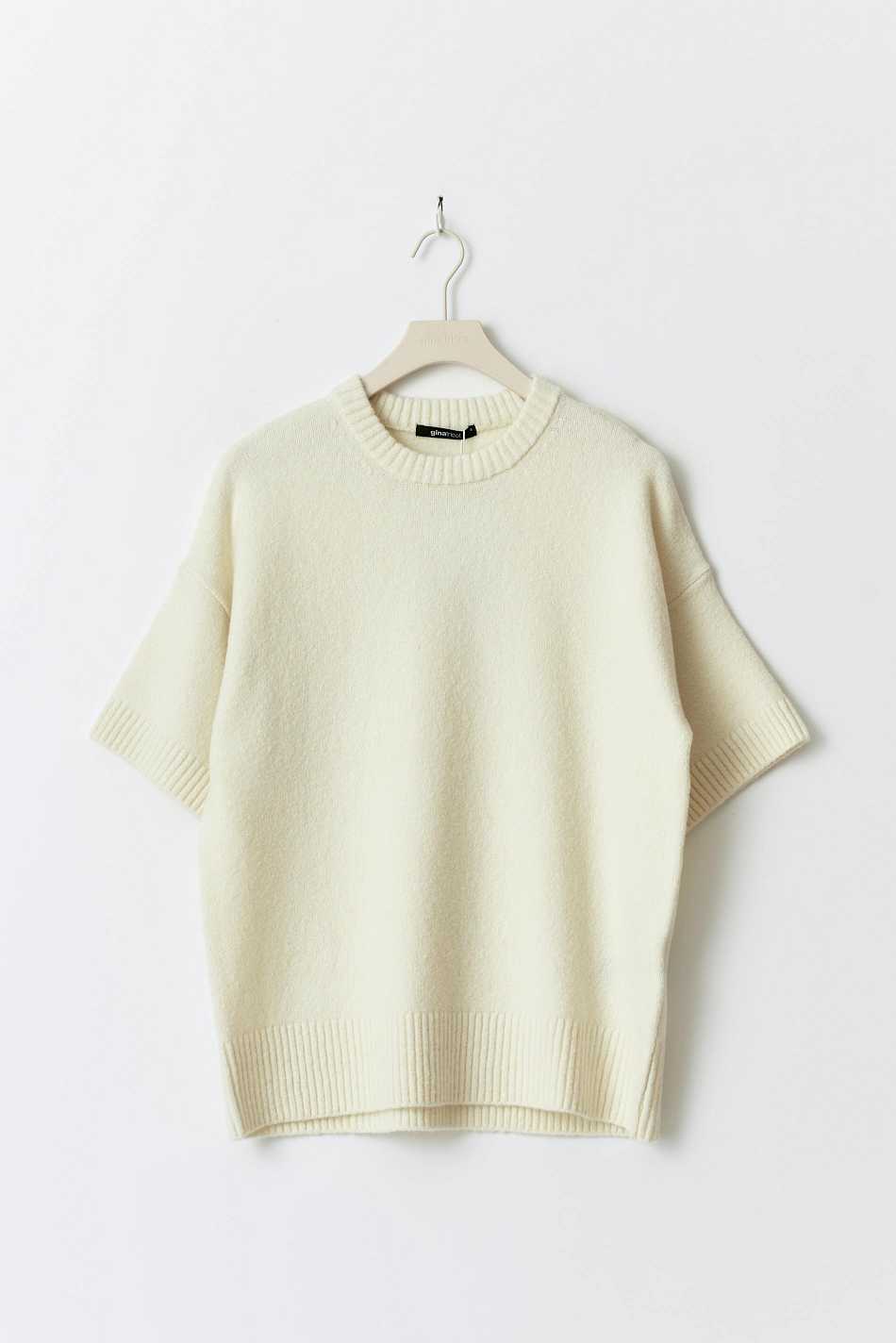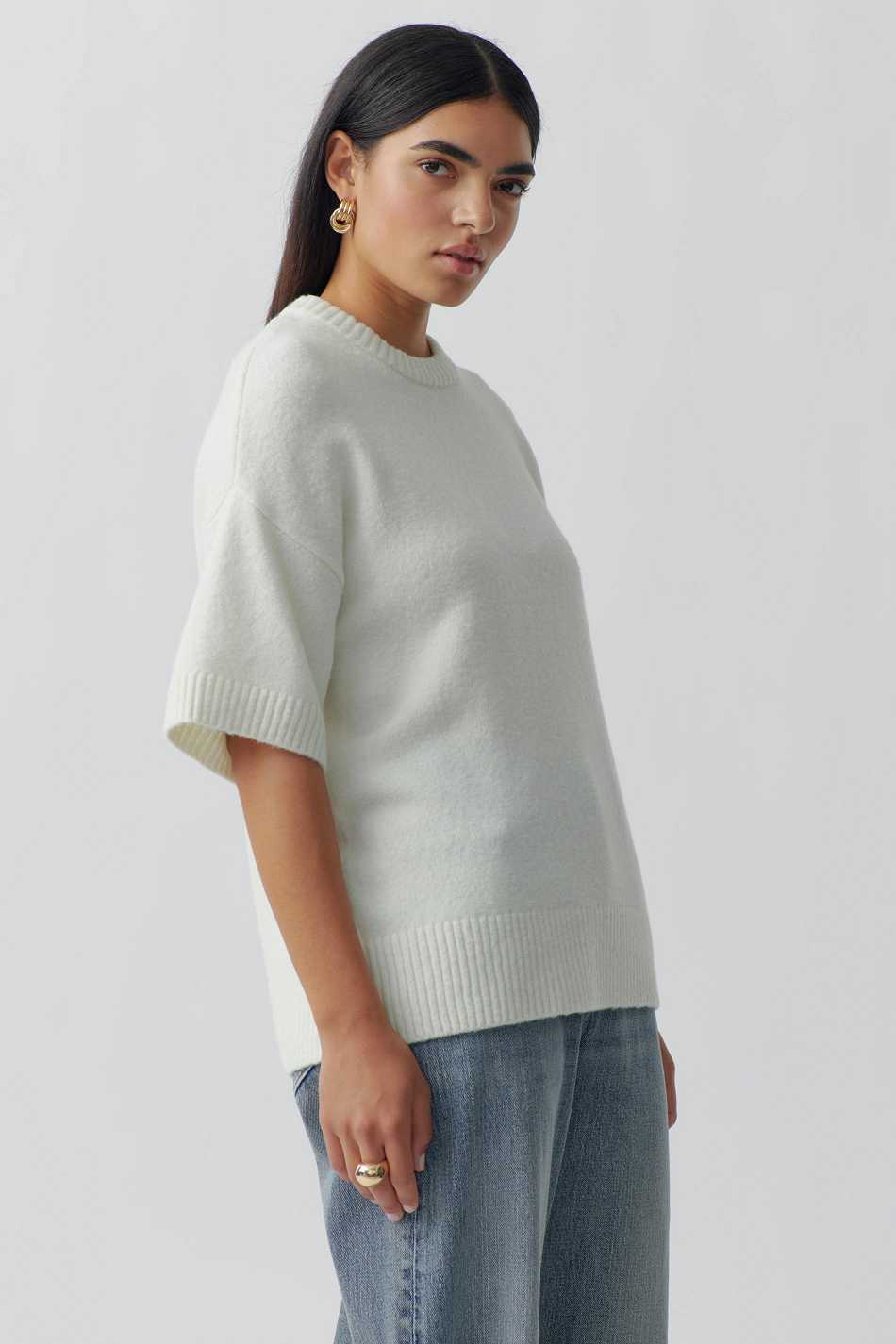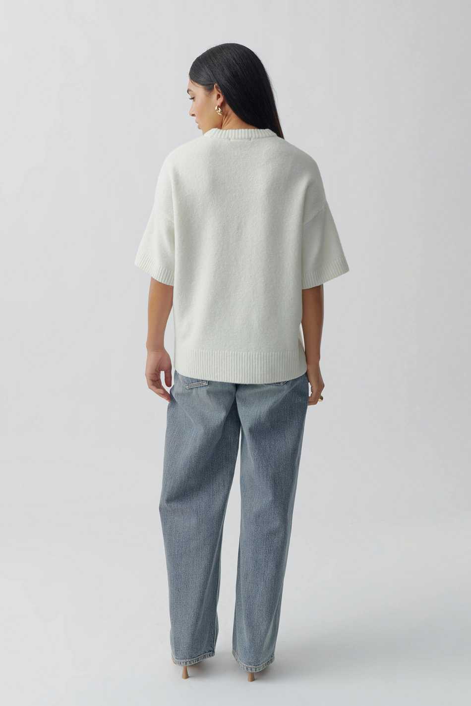 Knitted t-shirt with short sleeve. The t-shirt is white and has oversize fit. It has round neckline and rib knit at sleeve ends and at the bottom.