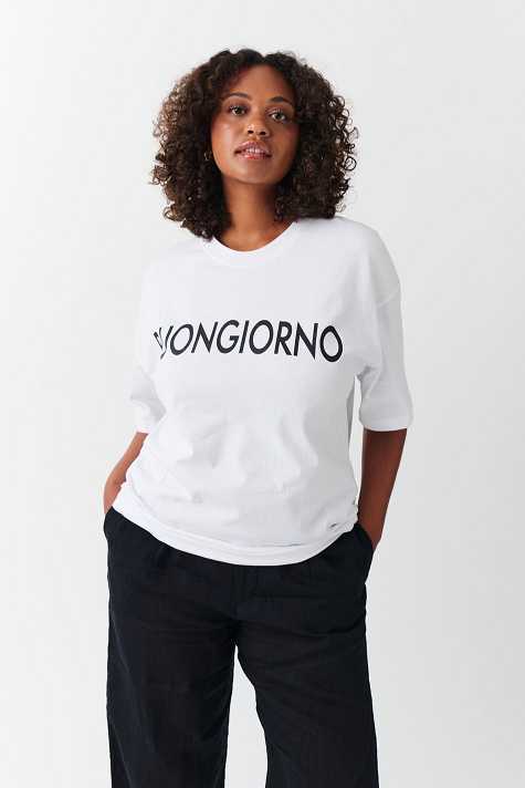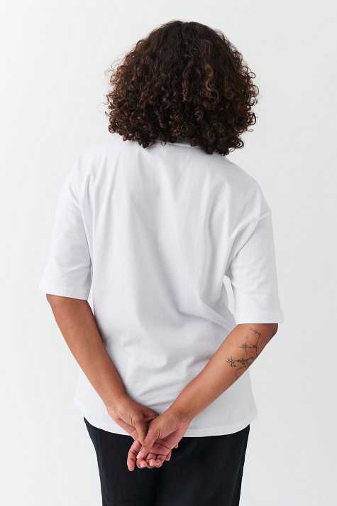 Oversized t-shirt in cotton with text print at the front. The t-shirt is white and has short sleeve. It has round neckline and dropped shoulder.