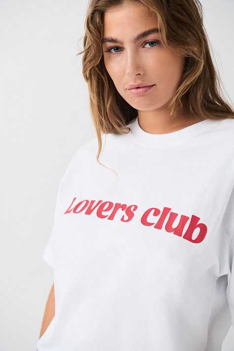 Oversized t-shirt in cotton with print at the front. The t-shirt is white and has short sleeve. It has round neckline and dropped shoulder.