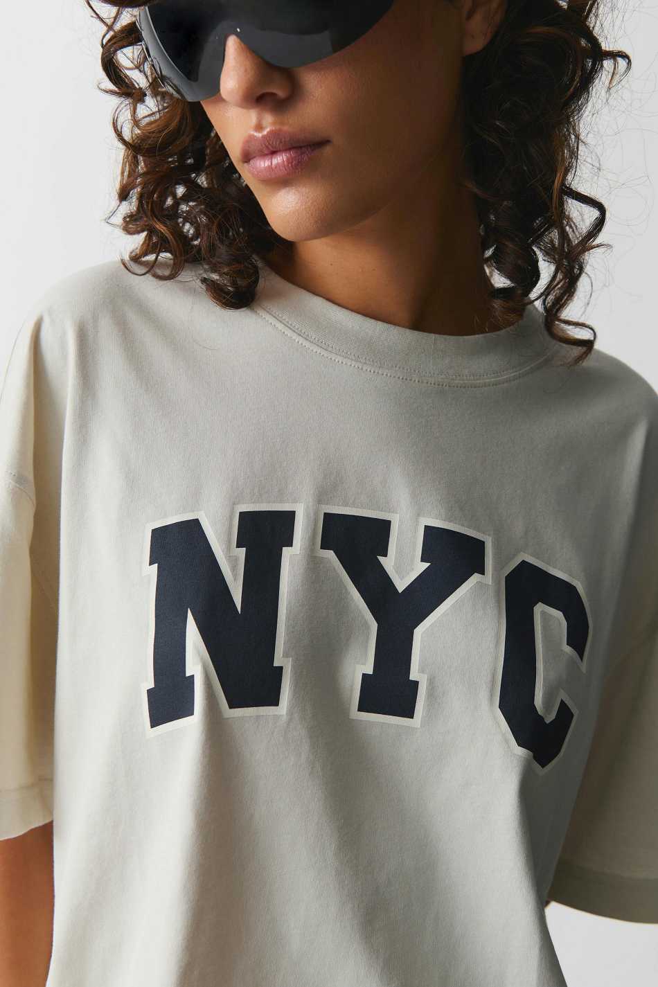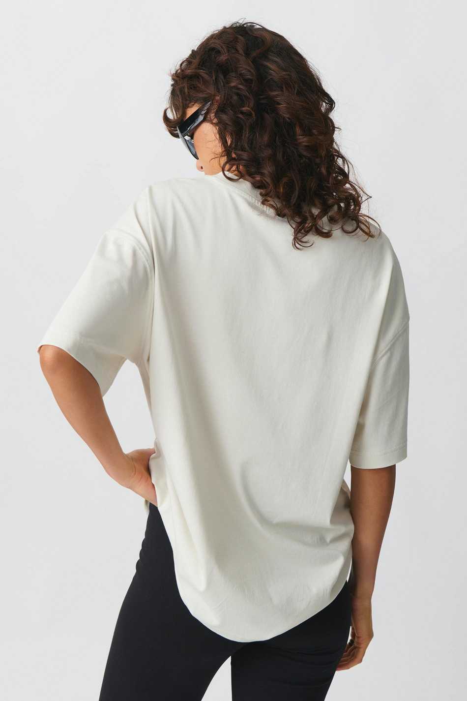 Oversized t-shirt with print at the front. The t-shirt is beige and has short sleeve. It has crew neckline and long fit.