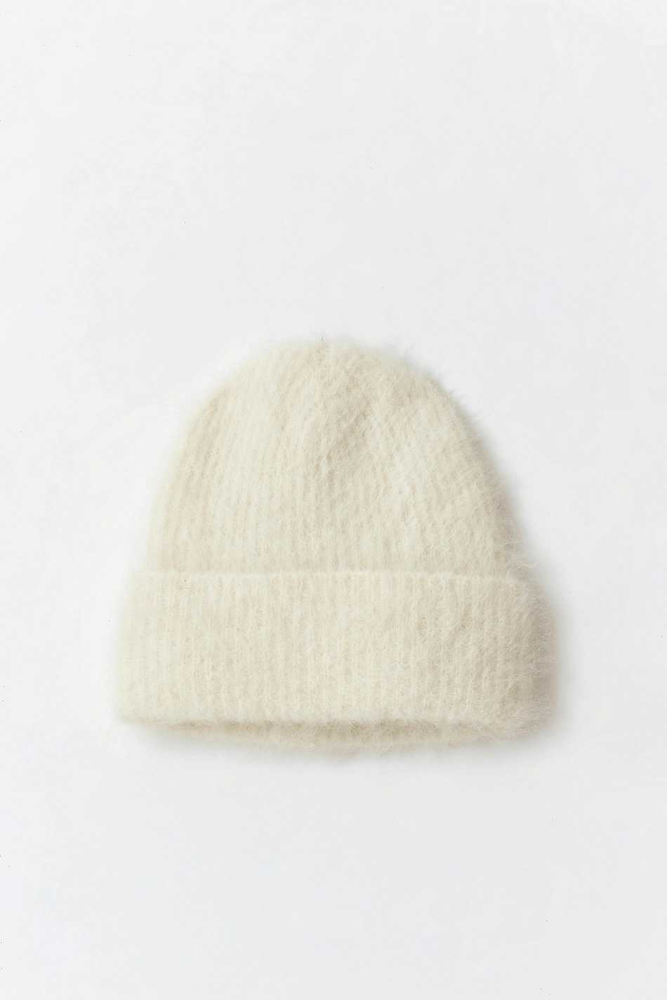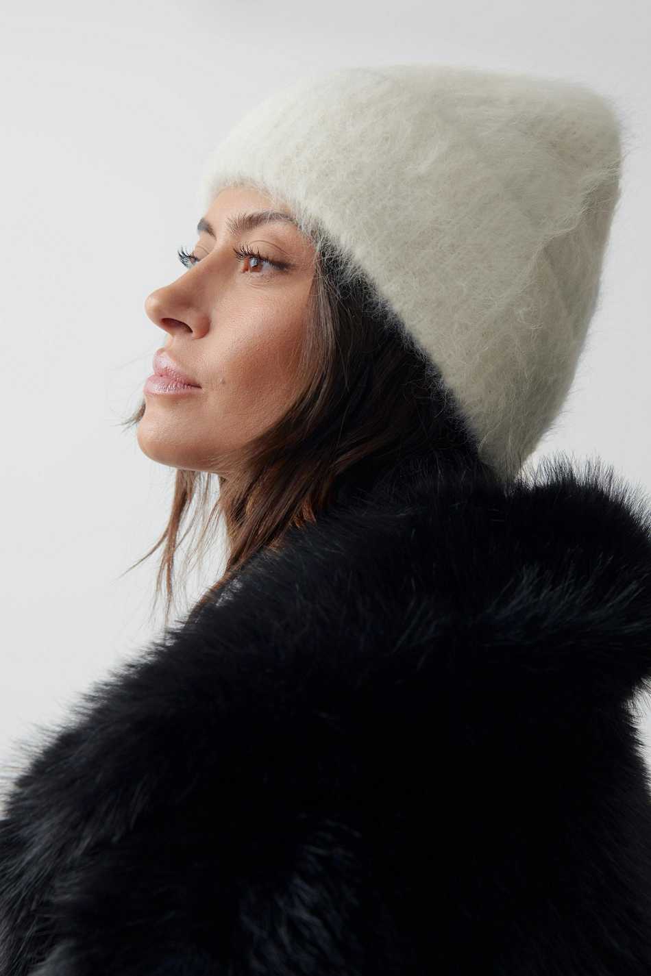 Knitted beanie in soft alpaca blend with fuzzy quality. The beanie is white.