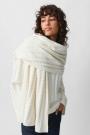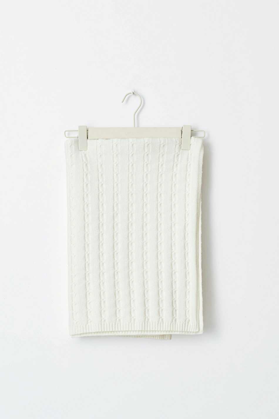 Cable knit scarf with soft quality. The scarf is white and has ribbed trims.