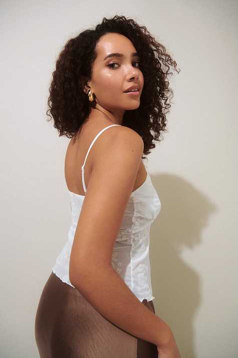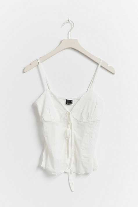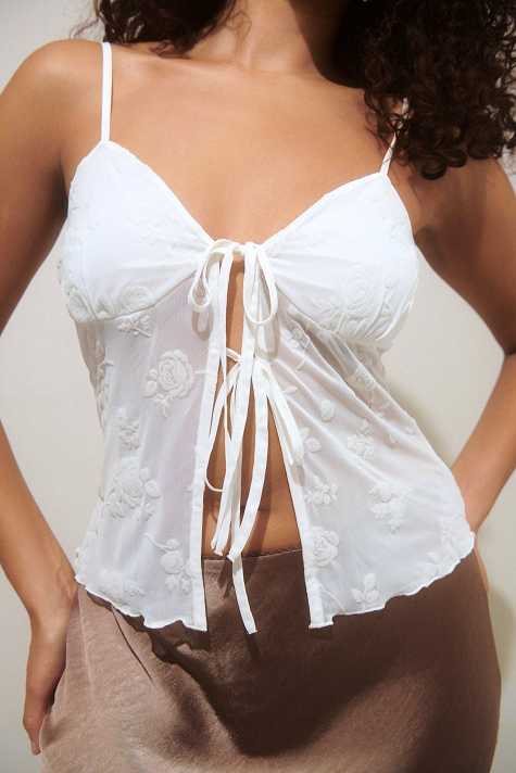 Sleeveless tie top with floral pattern. The top is white and has narrow, adjustable shoulder straps. It has knot closure at the front and lined cups with ruching and seam detail.