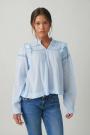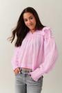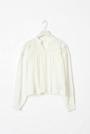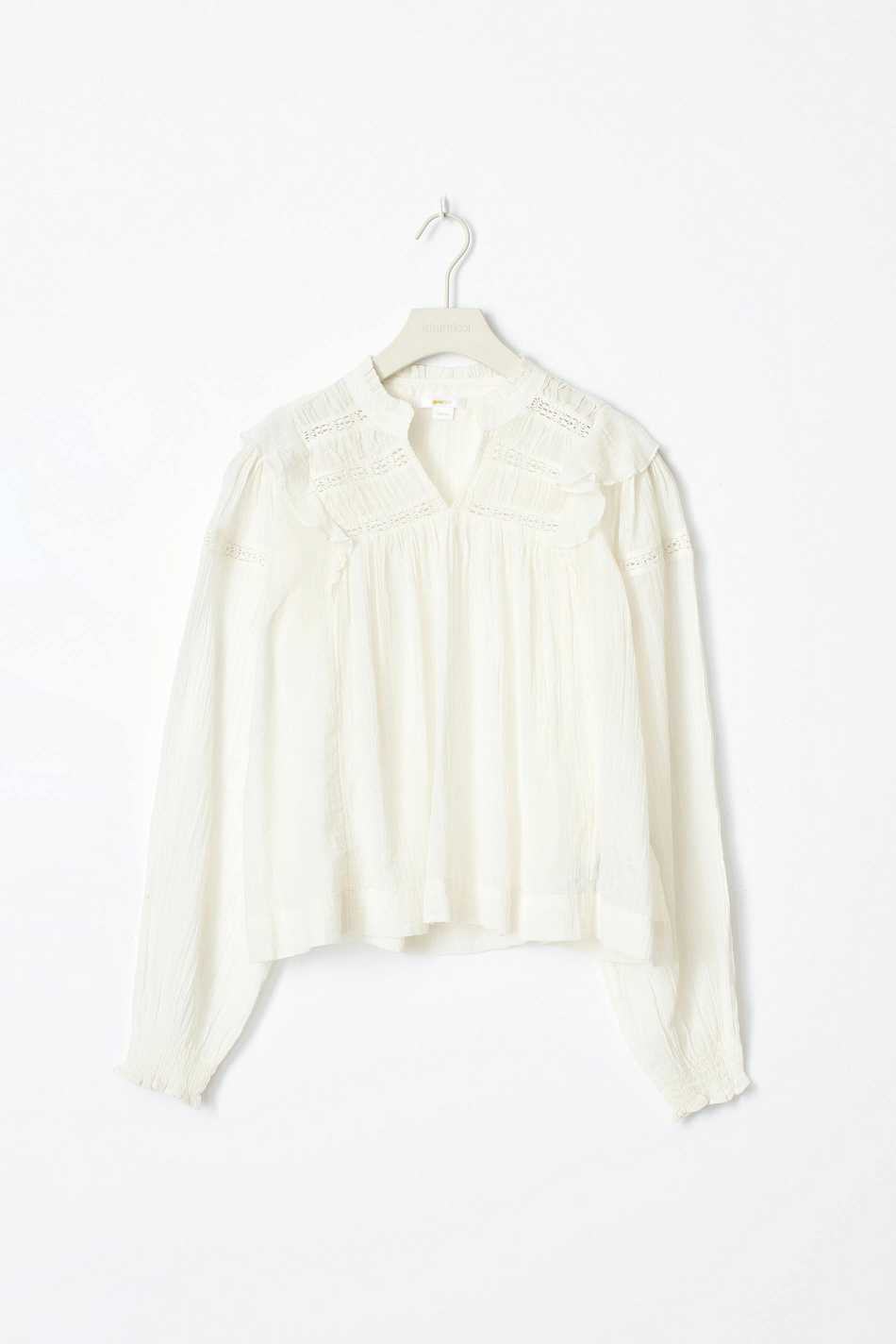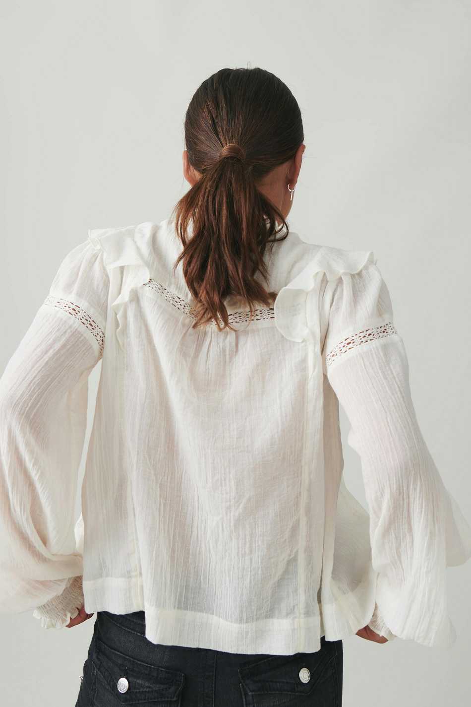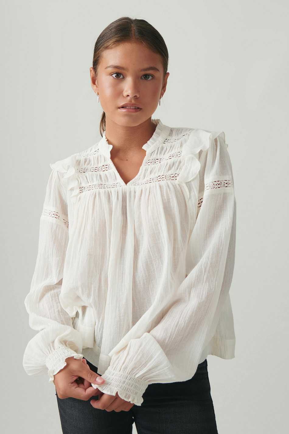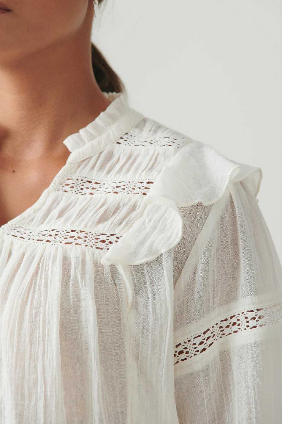 Blouse with oversize fit. The blouse is white and has small collar with frills. It has v-neck, gathered seams at the top, lace details, balloon sleeve and smocking at sleeve ends.