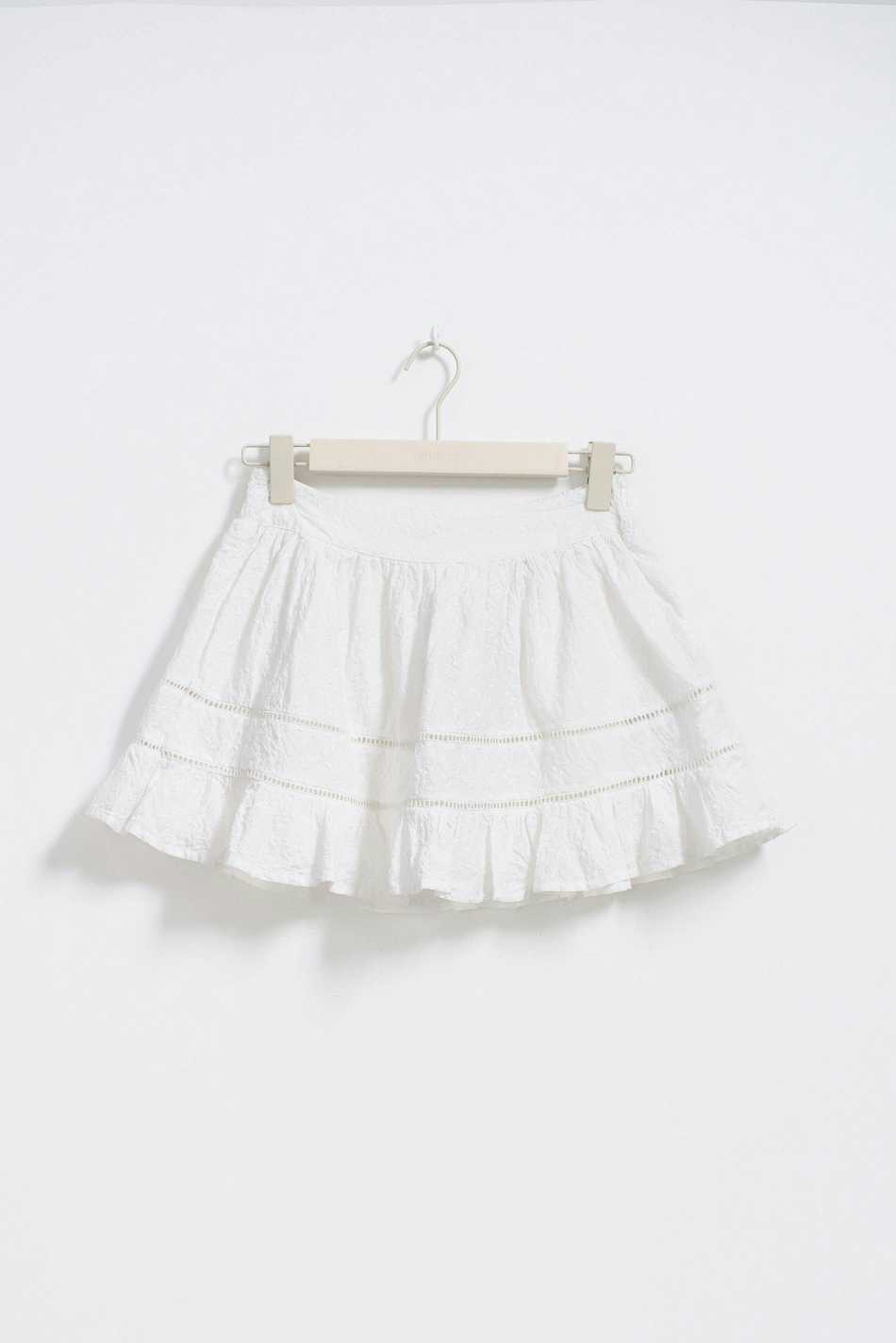 Embroidered skirt with high waist. The skirt is white, short and fully lined. It has structured material, woven quality, smocking at the waist and frill at the bottom.