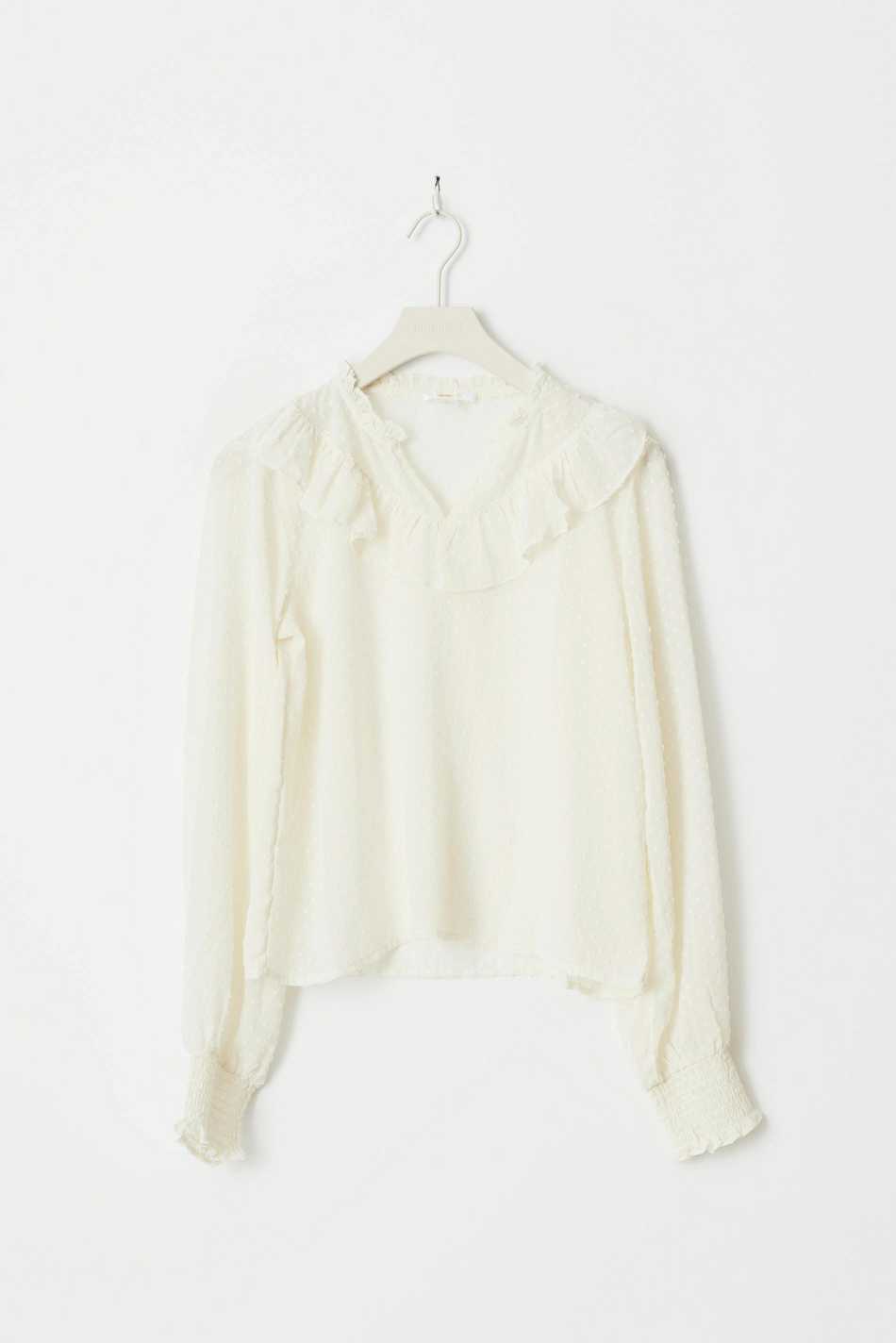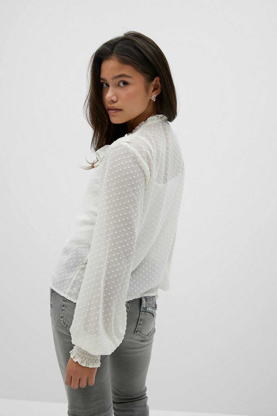Dotted blouse with flounces on the neckline. The blouse is white and has oversize fit. It has small collar with frills, balloon sleeve with smocking on the sleeve ends and v-neck.
