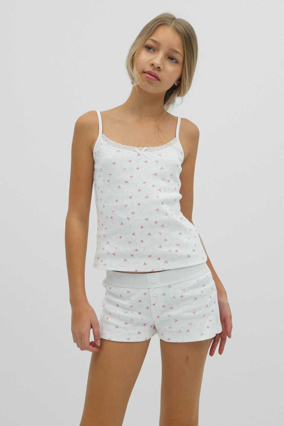 Singlet with lace on the neckline. The singlet is white and has bow at the front. It has figure-hugging fit and thin shoulder straps.