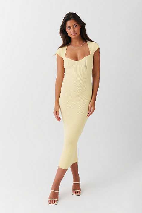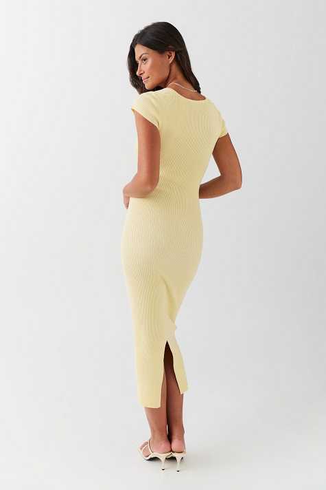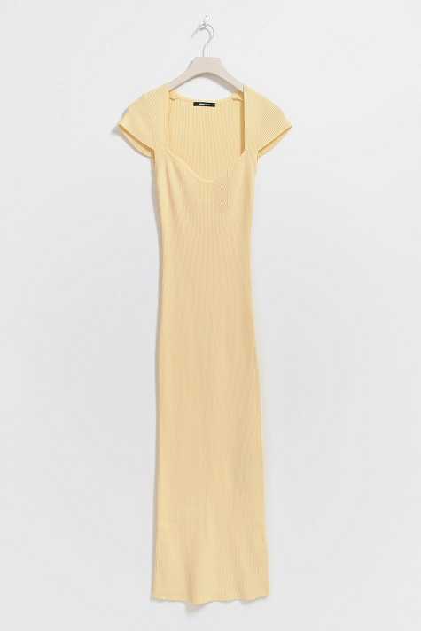 Knitted dress with sweetheart neckline. The dress is yellow, short-sleeved and ribbed. It has figure-hugging fit, fully-fashioned section at chest, slit at the back and midi length.